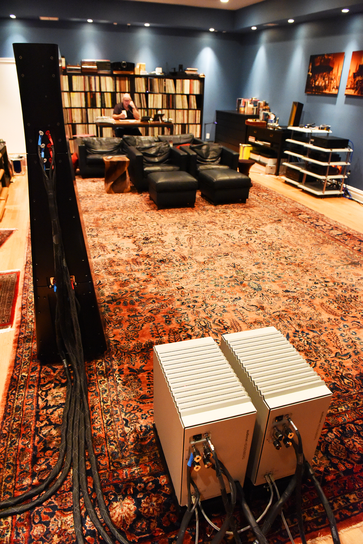 The view from the speaker side of the GTT Audio reference listening room, looking back at the listening position. Bill Parish is at his desk in the back of the space, at his desk in front of some of his LP cabinets. The quite comfortable listening couches are in place right in front of his desk.