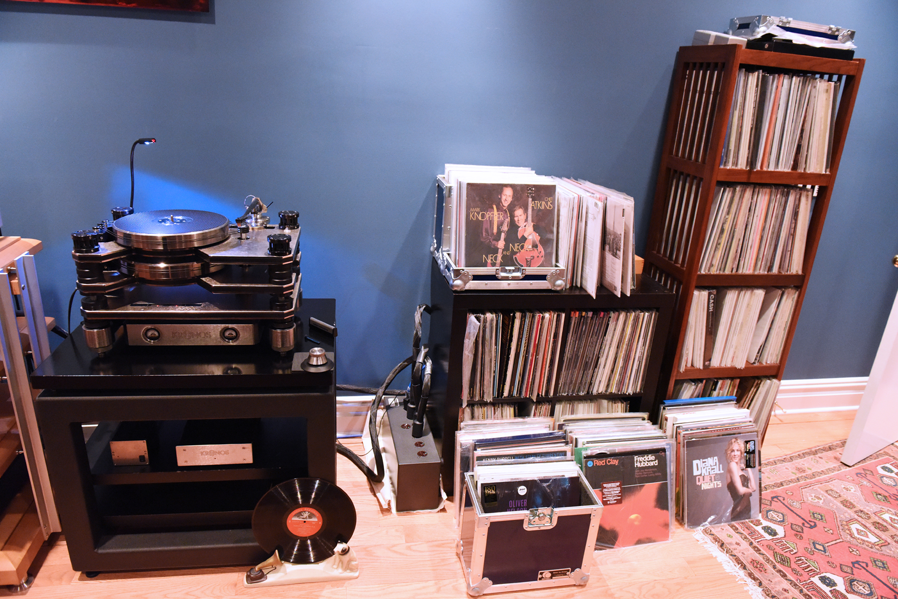 Bill ushered me into his large listening room for this evaluation of the new setup. As always, this room is done to the absolute nines, with an exceptional combination of room size and configuration, attention to detail (including power feeds and lighting), and wondrous components. The seating is comfortable, and there was plenty of espresso and fine drink to turbocharge the listening sessions. We focused on listening to LPs only via the KRONOS Pro LE turntable system, a very well-known source in my experiences, both here and at shows.