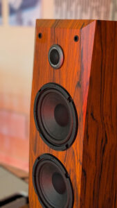 Ensis is a three-way semi-active loudspeaker, with a soft dome tweeter and a very costly, custom made by Audio Technology midrange driver. Mr. Ejvind Skaaning and his son, Pera Skaaning are owners of this company. In the past Mr. Ejvind founded and for many years led Dynaudio and Scan Speak. Drivers sit in a narrow, rounded at the back enclosure, quite high up above floor level, and the front baffle is slightly tilted towards the back. The cabinet is made of several layers of wood of different density with a vibration damping material placed between the layers.