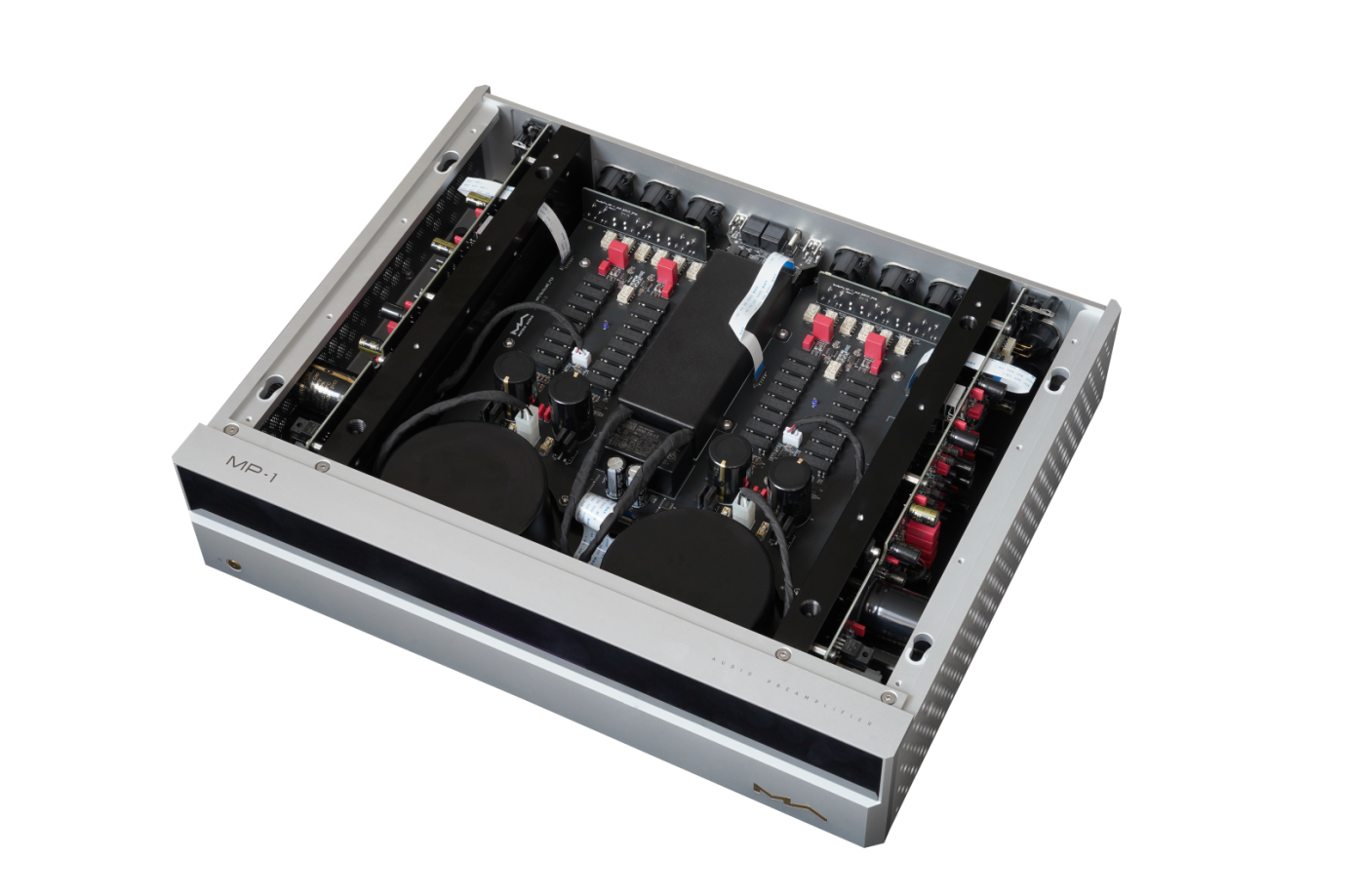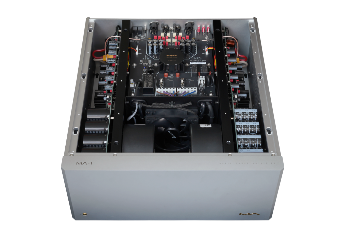 Power output of the MA-1 amplifier is 250 WPC into 8-ohms and 450 WPC into 4-ohms. The amplifier uses 10 ONSEMI transistors per channel. The amplifier is a Class A/B design that remains in Class A for a significant portion of its power range. The amplifier has true dual mono architecture, with independent power supplies for each channel. Each channel contains a 625 watt toroidal transformer and a bank of 14 capacitors with 190,000 µF of capacitance. Furthermore, each channel has separate power supply circuits for the input and amplification stages of the amplifier.